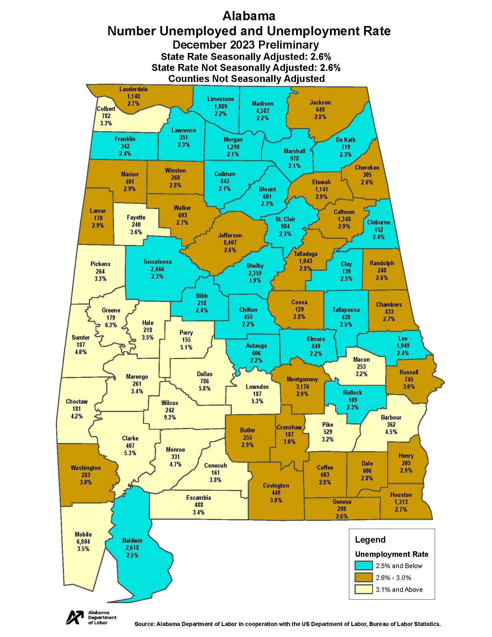 Alabama’s preliminary, seasonally adjusted December unemployment rate is 2.6%, up slightly from November’s rate of 2.4%. December’s rate is equal to December 2022’s rate of 2.6%. The rate represents 59,454 unemployed persons, compared to 55,462 in November and 59,986 in December 2022.