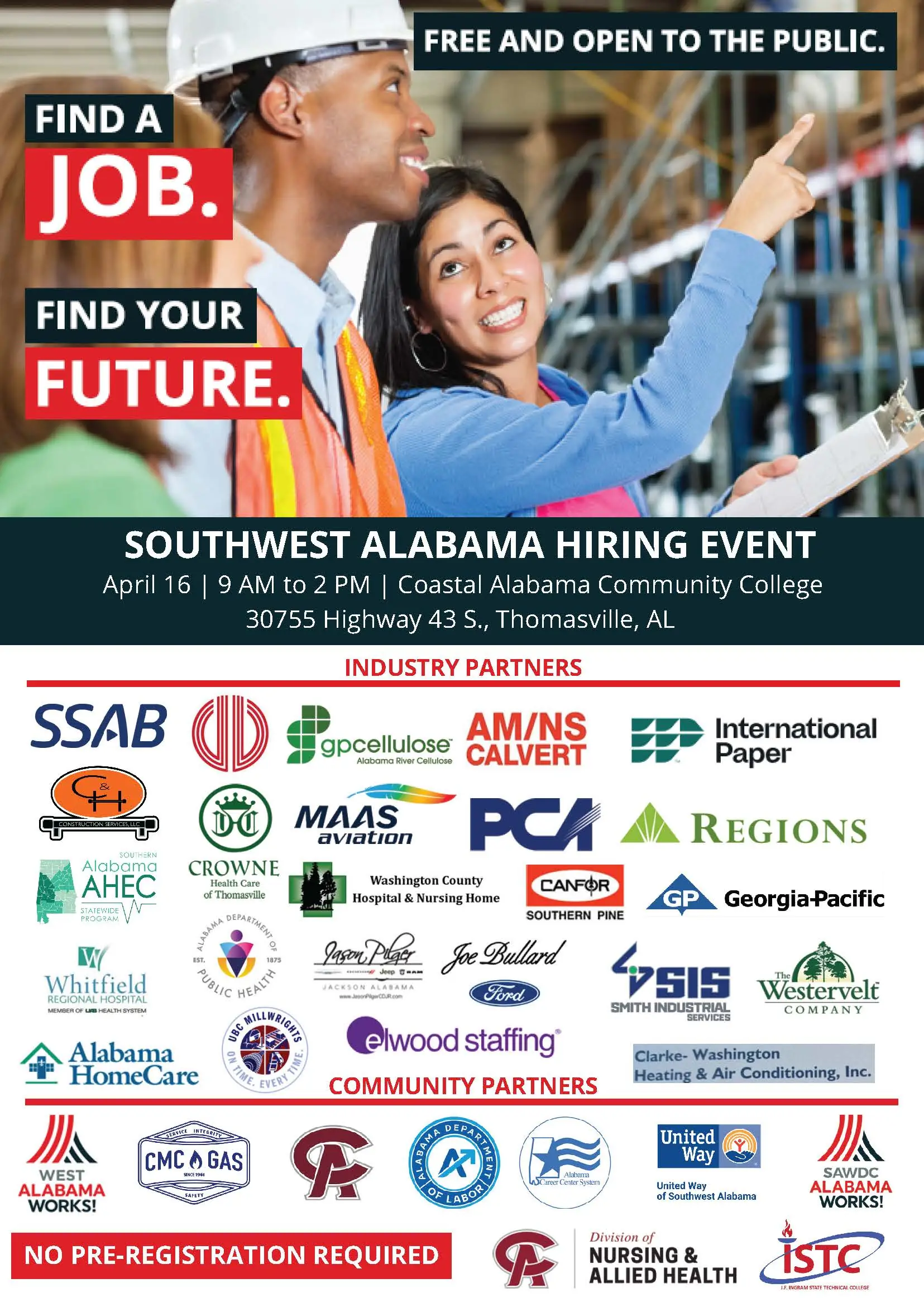 Jackson – The Jackson Career Center is hosting the Southwest Alabama Hiring Event. “We are thrilled to have our regional business and industry partners join us at Coastal Alabama – Thomasville for this rural hiring event that is guaranteed to offer career pathways for job seekers and provide access to talent to our employers,” said SAWDC AlabamaWorks Executive Director, Bridget Wilson. Job candidates are encouraged to dress in a business-casual style and treat the event like a job interview. You are encouraged to bring copies of your resume, but it is not required to attend. This will be a come-and-go event and is free and open to the public.