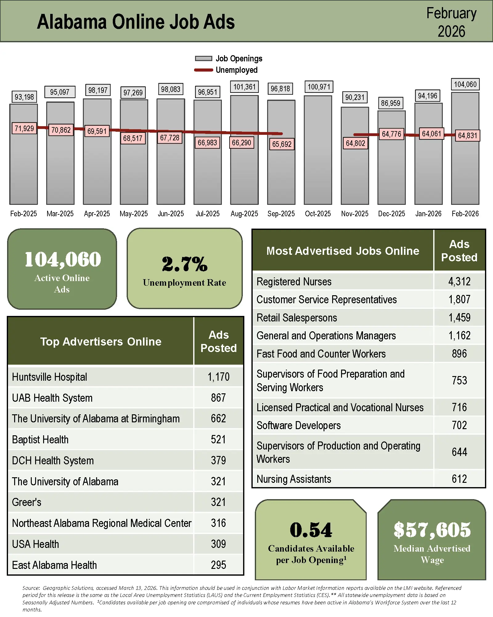 MONTGOMERY - Data collected and analyzed by the Alabama Department of Workforce’s Labor Market Information (LMI) Division shows that in February 2026, there were 104,060 job ads posted in Alabama, representing a monthly increase of 9,864 ads or 10.5% over the month. This also shows an 11.7% increase over the year from February 2025.