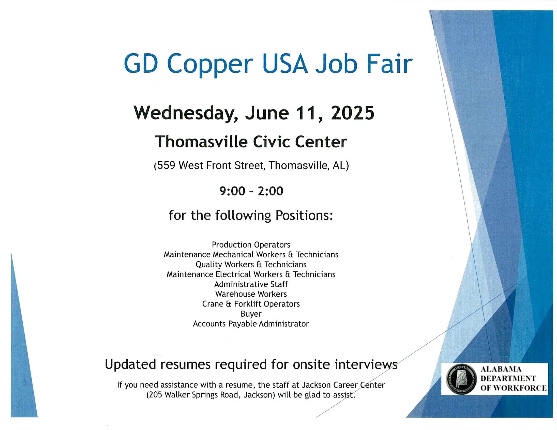 • The Jackson Career Center is Hosting a Job Fair for GD Copper USA