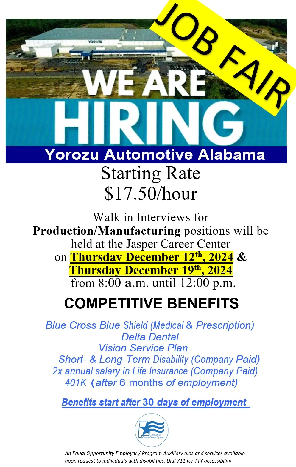 • The Jasper Career Center is hosting Job Fairs for Yorozu Automotive