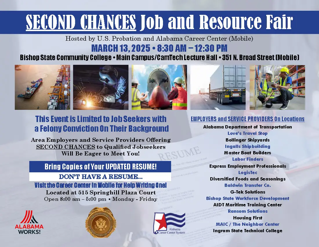• The Mobile Career Center and U.S. Probation will be Hosting the 3rd Annual Second Chances Job Fair